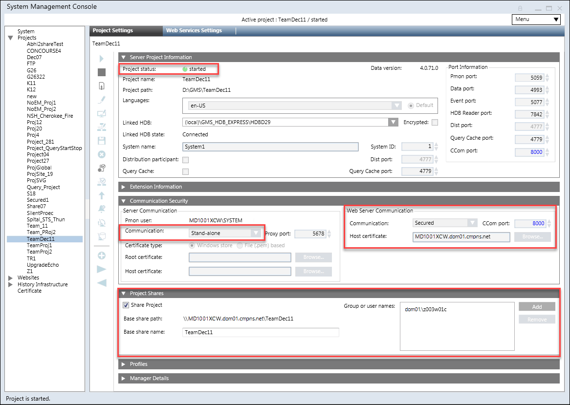 - (Only applicable when the project that you are about to link to the web application is in distribution with other projects) added in the list of allowed users in the Project Shares expander of all the systems (projects) in the distribution with system (project) linked to the web application. - The root certificate (.cer file) of the CCom host certificate of the linked Server project, is imported in the Trusted Root Certification Authorities (TRCA) store of the Local machine certificates store.