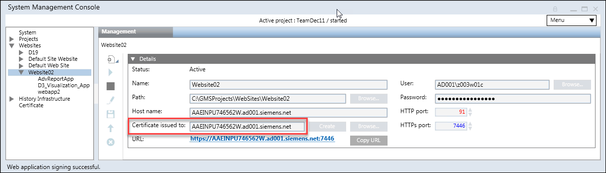 NOTE: Clicking the website/web application URL in the SMC results in opening the Desigo CC web page in your default browser. It is recommended to launch the Web/Windows App clients using Windows browser Internet Explorer 11 onwards.