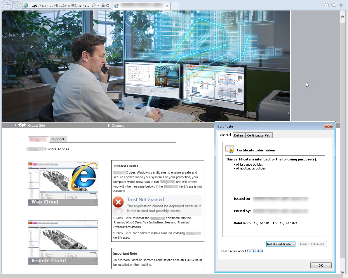 - In the Desigo CC web page, click the Support tab, and then select the Web Client Application Certificate link.