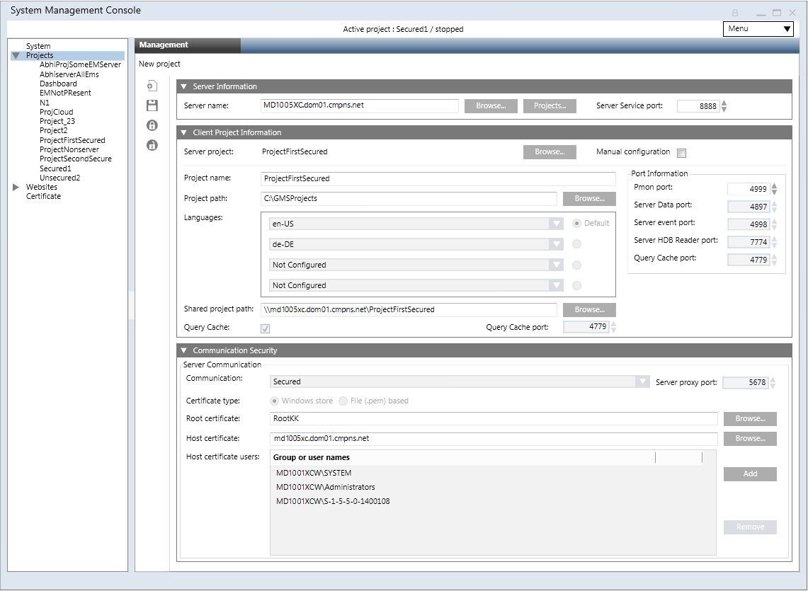 - Add the Server project’s Pmon user in the Host certificate users ensuring it has rights on the Server host certificate’s private key.