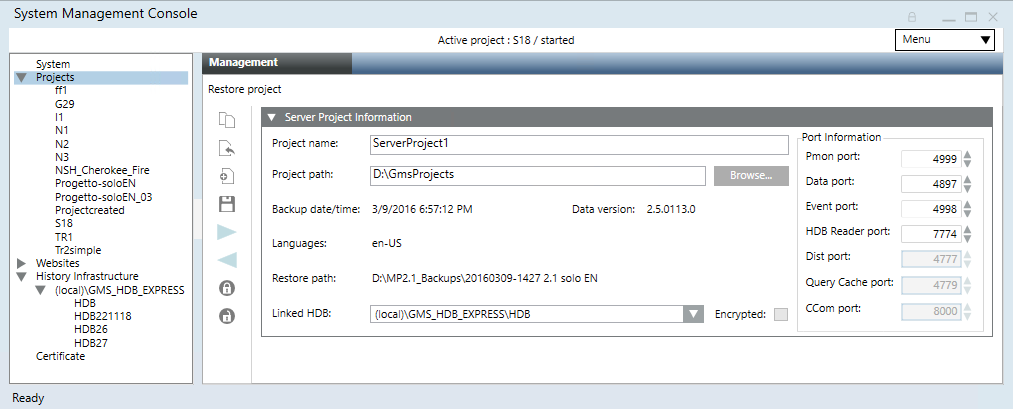 - The Server Project Information expander displays with the fields filled in (including the port numbers and the history database) according to the selected backup.