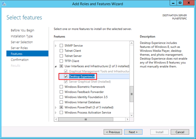 - Scroll down in the Features window, and expand User Interface and Infrastructure and select Desktop Experience.