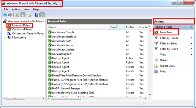 - In the Windows Firewall with Advanced Security dialog box, click Inbound Rules.
