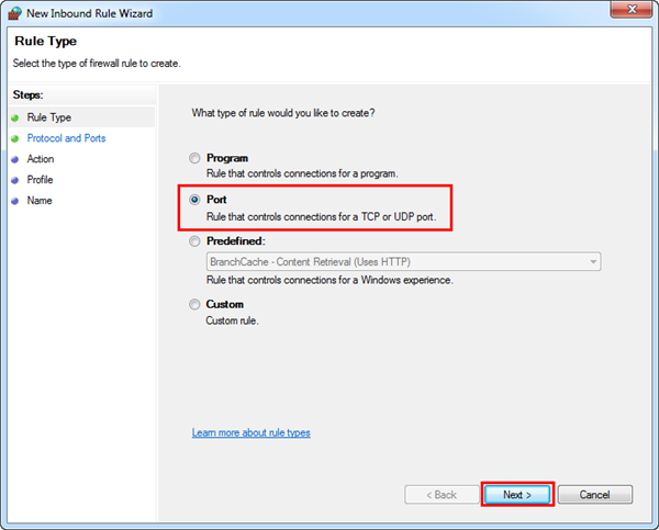 - From Rule Type, select Port, and then click Next.