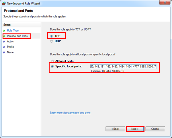 - From Protocol and Ports, select TCP.