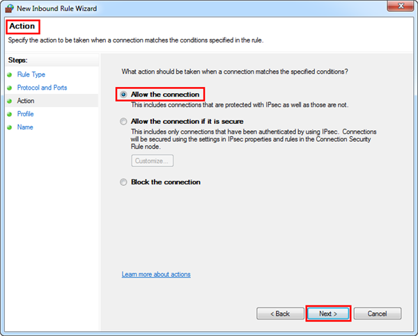 - From Action, select Allow the connection, and then click Next.