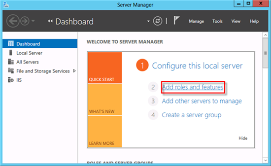 - In the Manage menu, click Add Roles and Features.