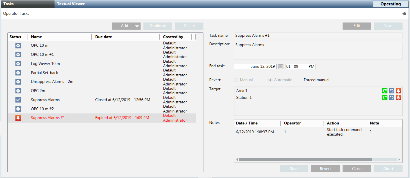 If you select a task, its details display on the right. If you hover over the target object, a tooltip displays its full path in System Browser. You can edit tasks data, start, abort, close, and do automatic or manual revert, provided that the configuration includes the revert mode (that is, returning to a former state. For example, in fire panels, from Test Mode to Normal Mode.)